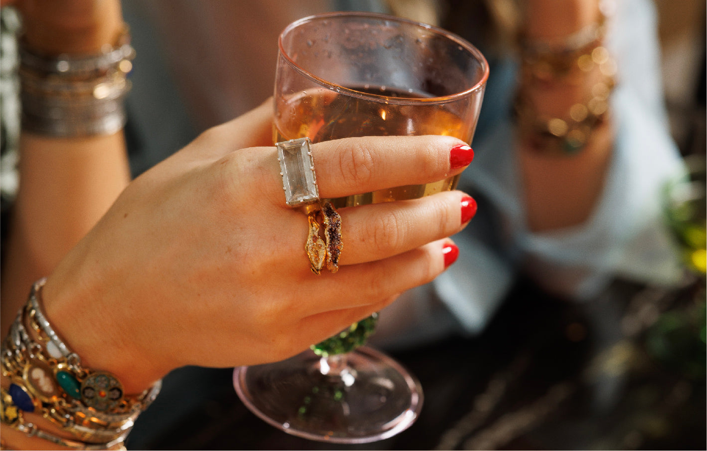 We fell hard for this CÂPÂ lettuce ring. The interior is hand-painted glass - no two are exactly alike - and this ring manages to be both subtle and a statement. It’s the kind of piece everyone **gasps** over.