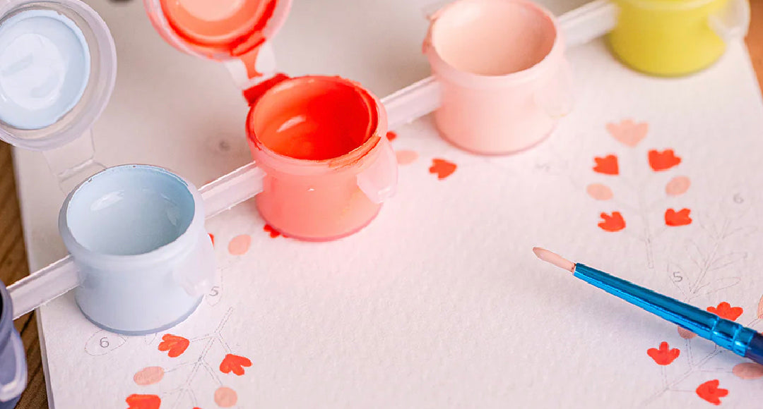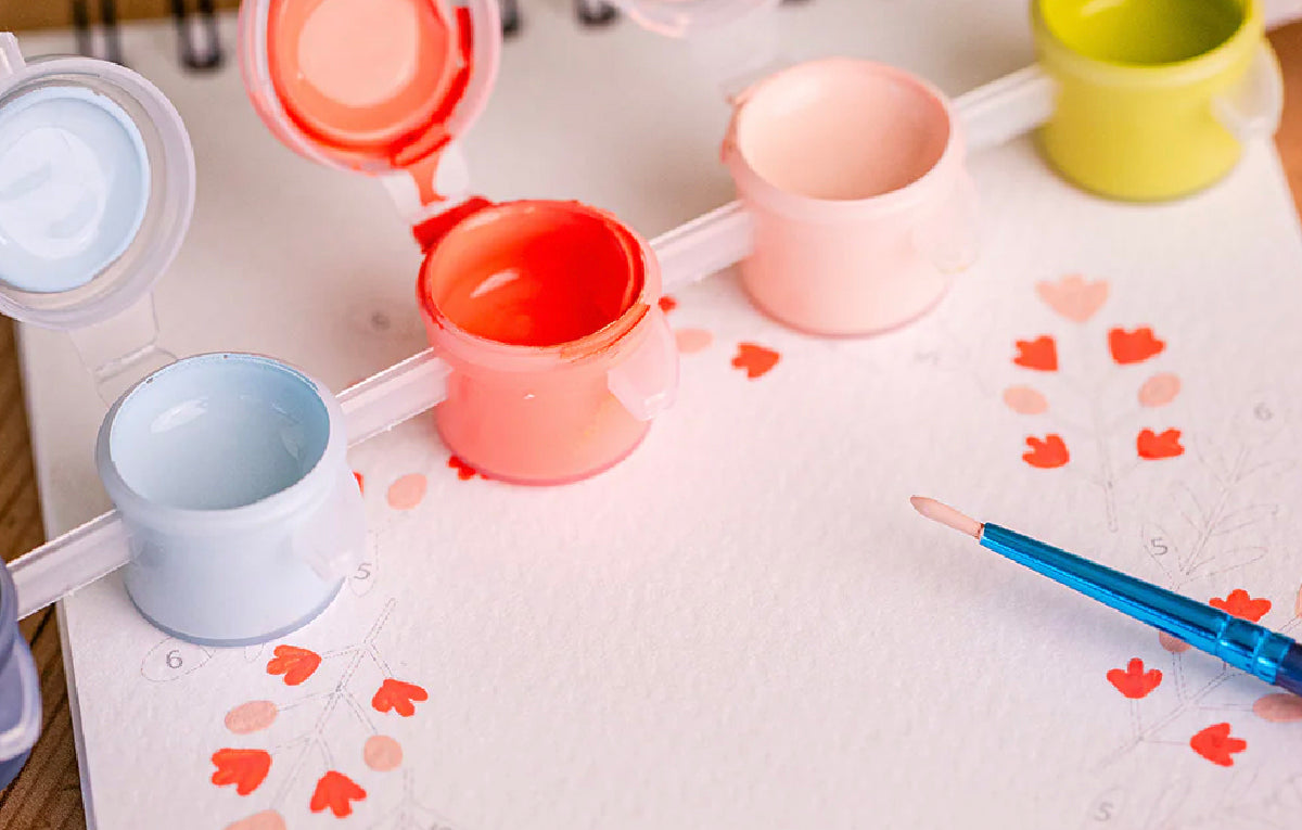 Each kit comes with a flipbook of 10 design cards, 6 paints, and 2 brushes.