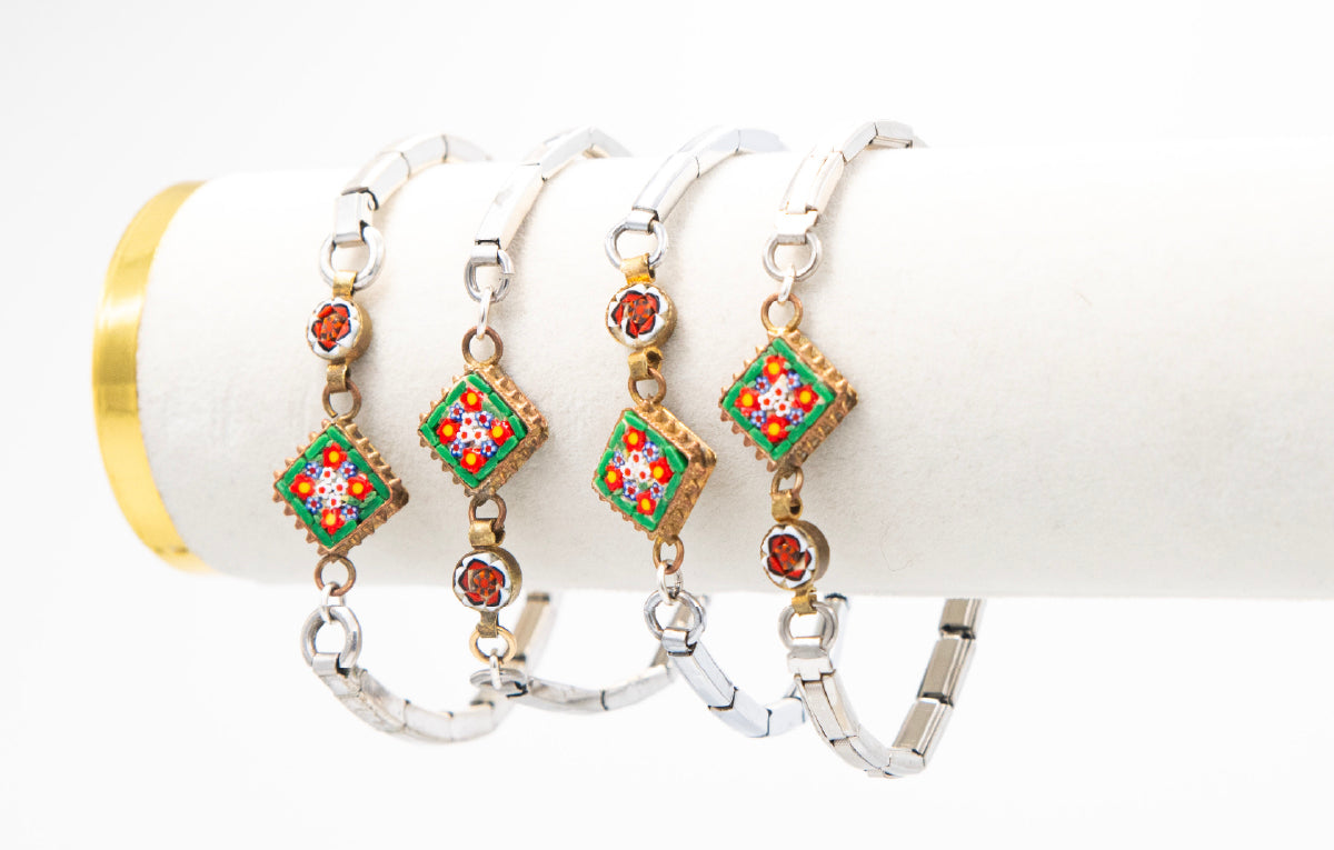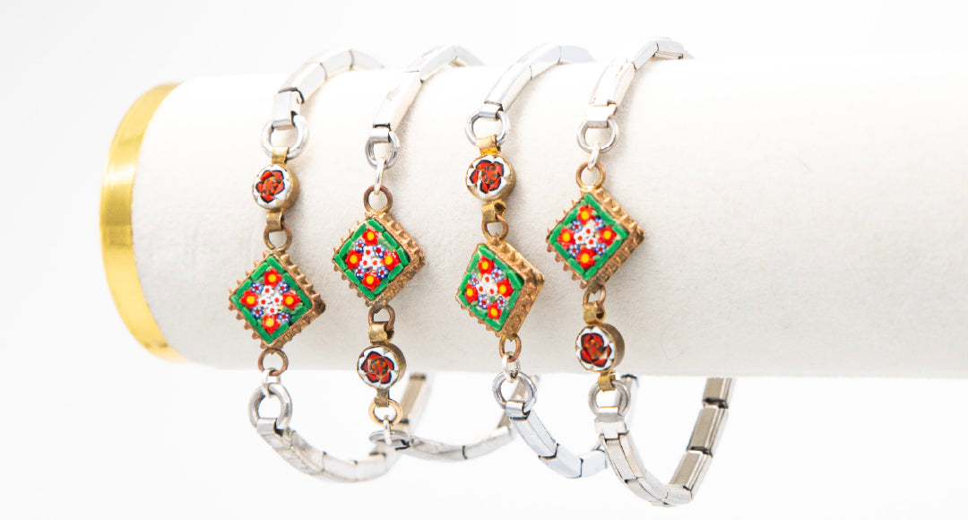 These bracelets celebrate one of jewelry’s most intricate art forms: the Italian micro mosaic. Each features a vintage watch band paired with a mosaic centerpiece - tiny glass tesserae hand-laid, one by one, to form delicate floral patterns.