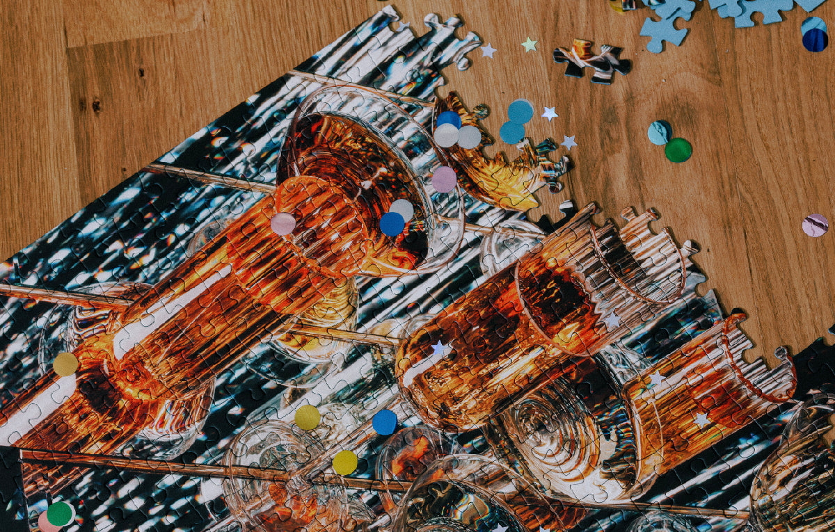 This puzzle + pretty glasses + champagne + NYE crowns + lipstick = best ever New Year’s Eve In. Someone make me a playlist (“All The Right Pieces”?) to go with. K thanks.