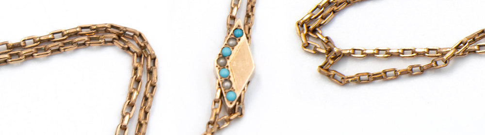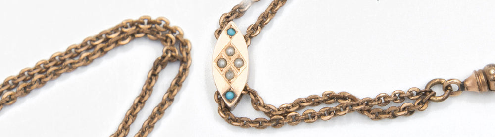 Gold-Filled Victorian chatelaine necklace with sleek lozenge slider featuring turquoise and seed pearl stones in a curb chain with a working dog clip.