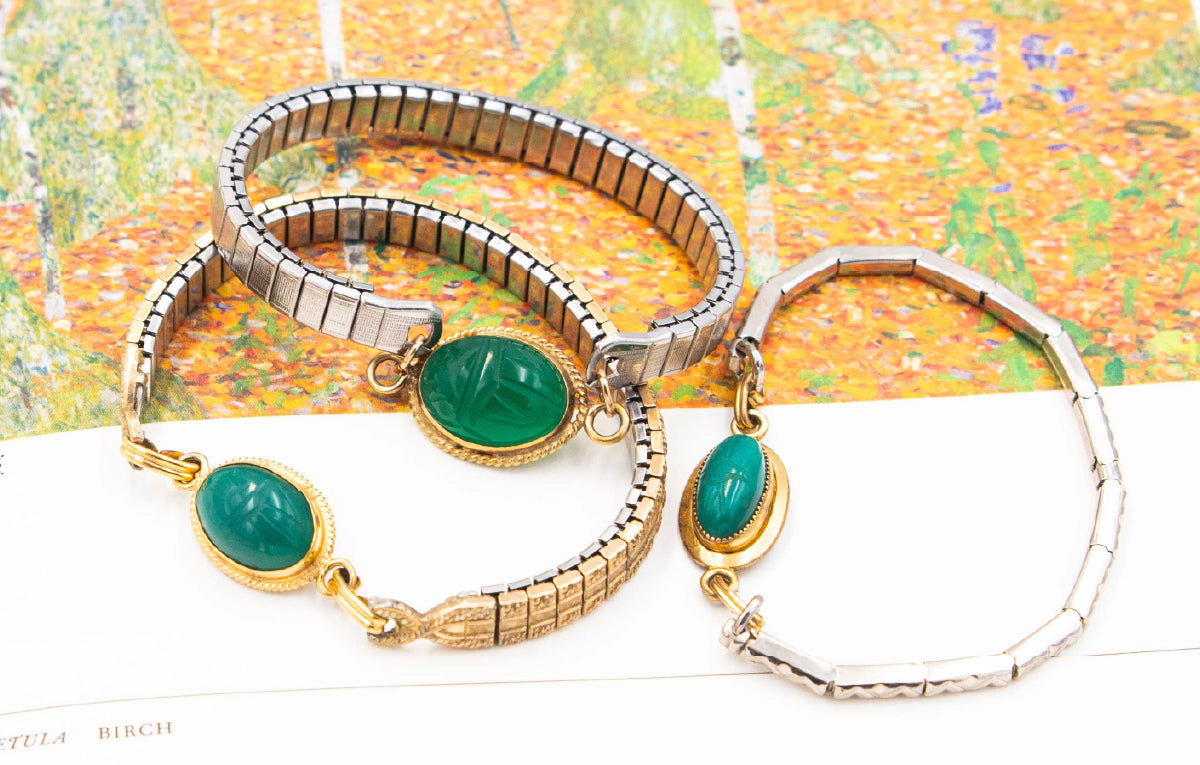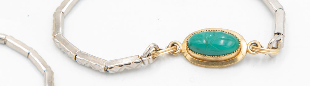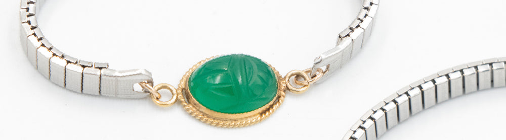 The scarab - one of the oldest symbols in jewelry, found as early as 1550 BC - represents creation, renewal, and protection. During the 1940s–60s, designers reinterpreted this ancient motif in colorful carved stones and gold-filled settings, creating bracelets that felt bright, personal, and full of hope.