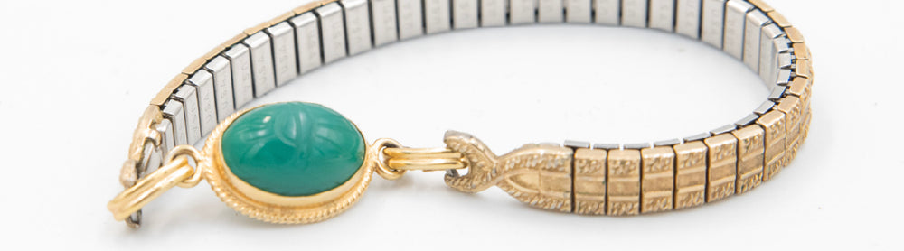 Authentic vintage scarab stones - with symbols of luck and renewal carved into their back - reimagined on gleaming watch bands.