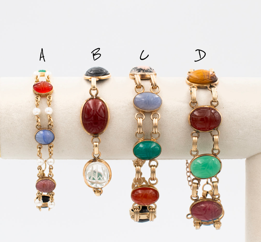 These vintage scarab bracelets feature genuine stones (which may include tiger’s eye, bloodstone, carnelian, jade, chalcedony, onyx, or quartz), the original etched carvings on the back (for luck and protection), and gold-fill (never gold plated!!!) settings.