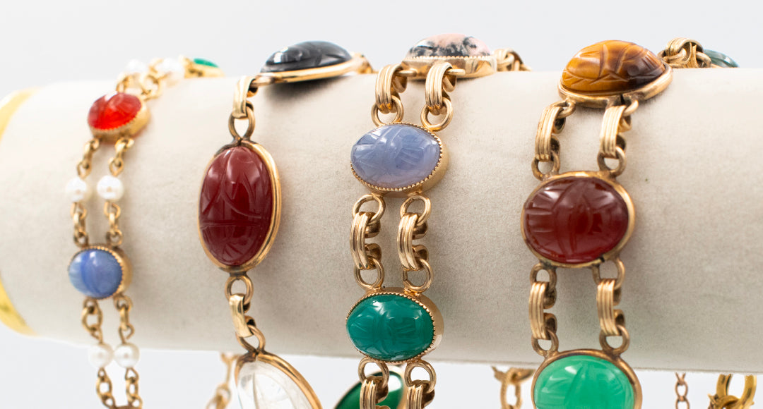 A small but mighty collection of mid-century scarab bracelets, each handpicked in collaboration with Kat of Stone Cooper, a vintage jewelry expert with 20+ years in the business.
