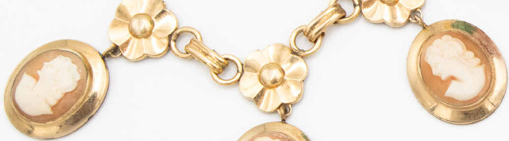 Three miniature cameos swing from an ornate gold-filled bar, giving these vintage 1940’s pieces a soft, romantic vibe that feels straight out of an old movie. It’s girly in the coolest way - and reads ever-so-slightly ballet core. Try tossing these on with a slouchy cardigan and tee.