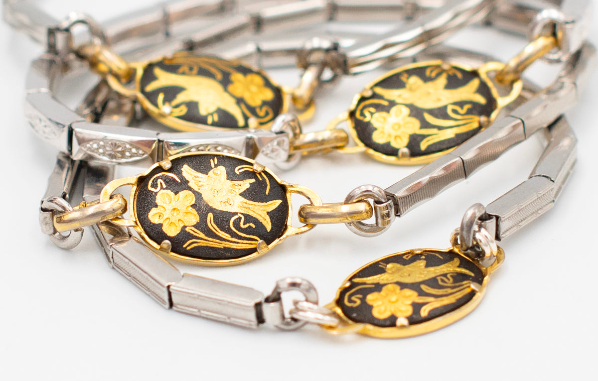These vintage panels, likely crafted in mid-century Barcelona, have been reimagined on flexible watch bands - each link handmade itself. The result is a bracelet that is timeless and rare: delicate gold motifs set against shadowed metal, glowing with quiet strength and history.