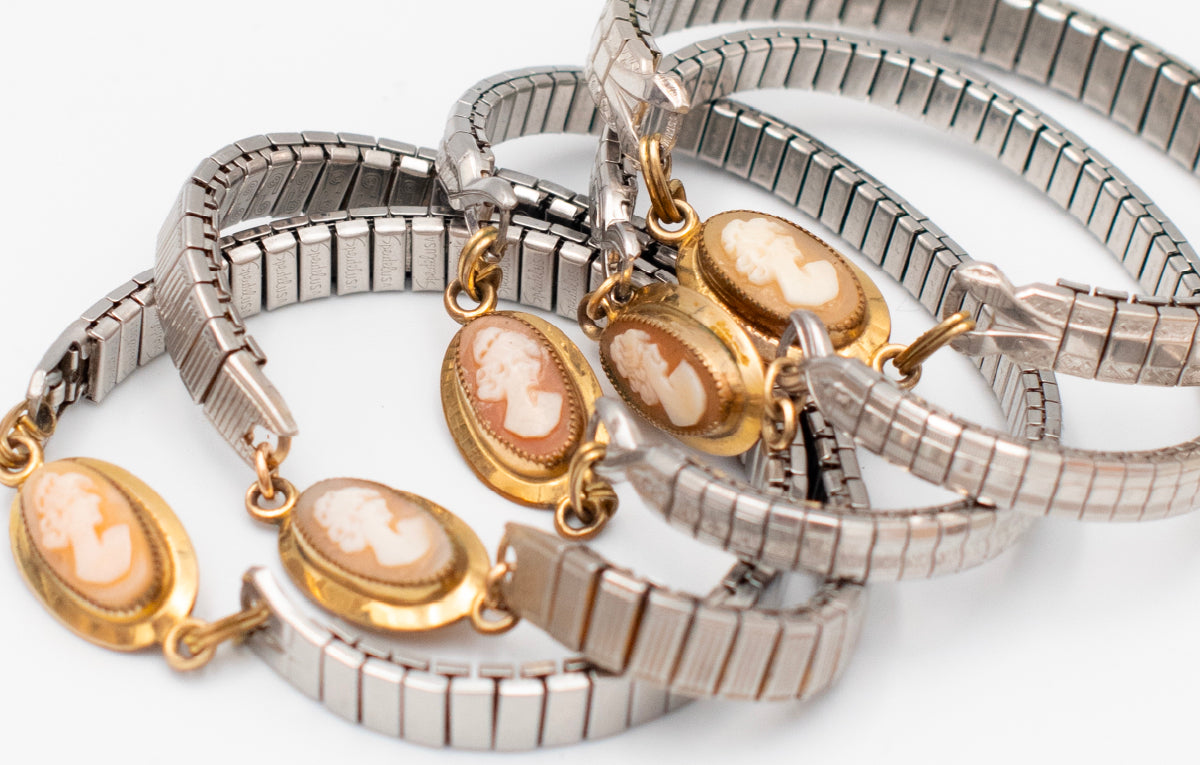 Mid-century cameos meet vintage watch bands in this quietly stunning pairing. Each bracelet features a hand-carved shell cameo (framed in gold fill!) from the 1950sā60s, reset on a stretch metal band reclaimed from vintage timepieces.