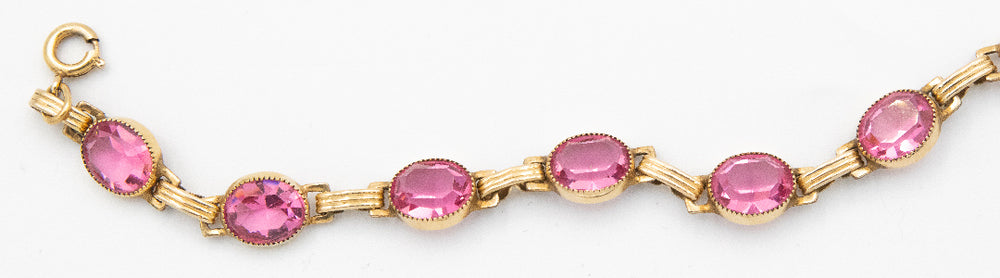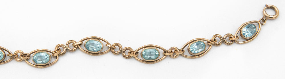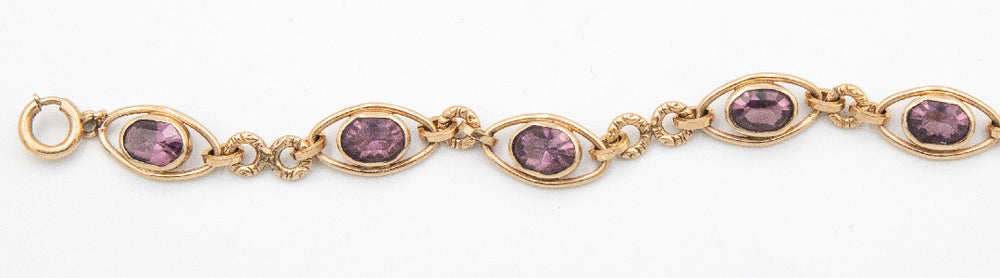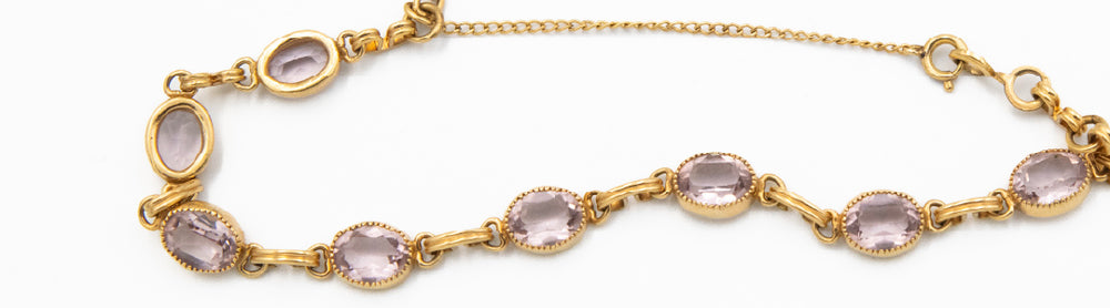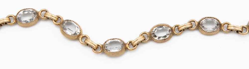 Made in the 1950s–60s, these bracelets feature faceted glass (or possibly zircon) stones in gold-filled settings that have developed a beautiful patina over time. These bracelets are perfect for everyday wear or dressing up.