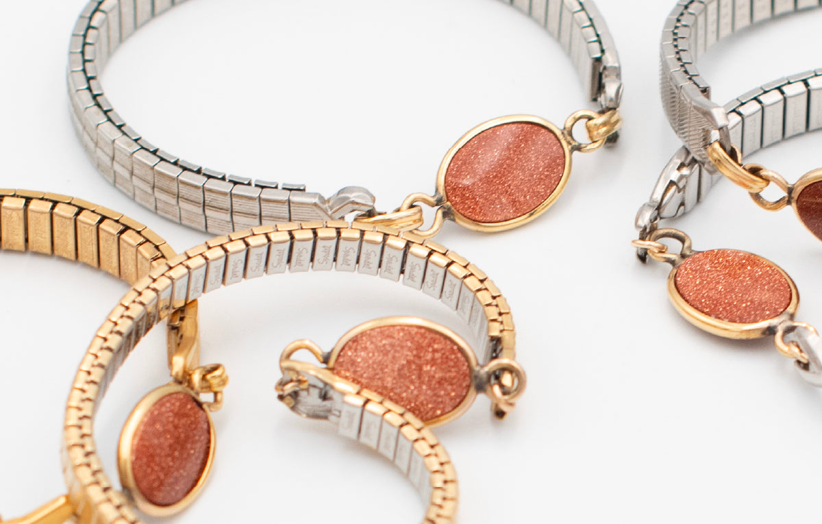 Goldstone’s sparkle isn’t an illusion - it’s the result of a centuries-old glassmaking process that suspends tiny metallic crystals in glass, creating its signature shimmer known as aventurescence. Legend has it that early Venetian artisans (possibly monks or alchemists) discovered Goldstone by accident while trying to make real gold. Set in vintage gold-fill and reimagined on reclaimed watch bands, these bracelets catch the light with a pretty, playful gleam.