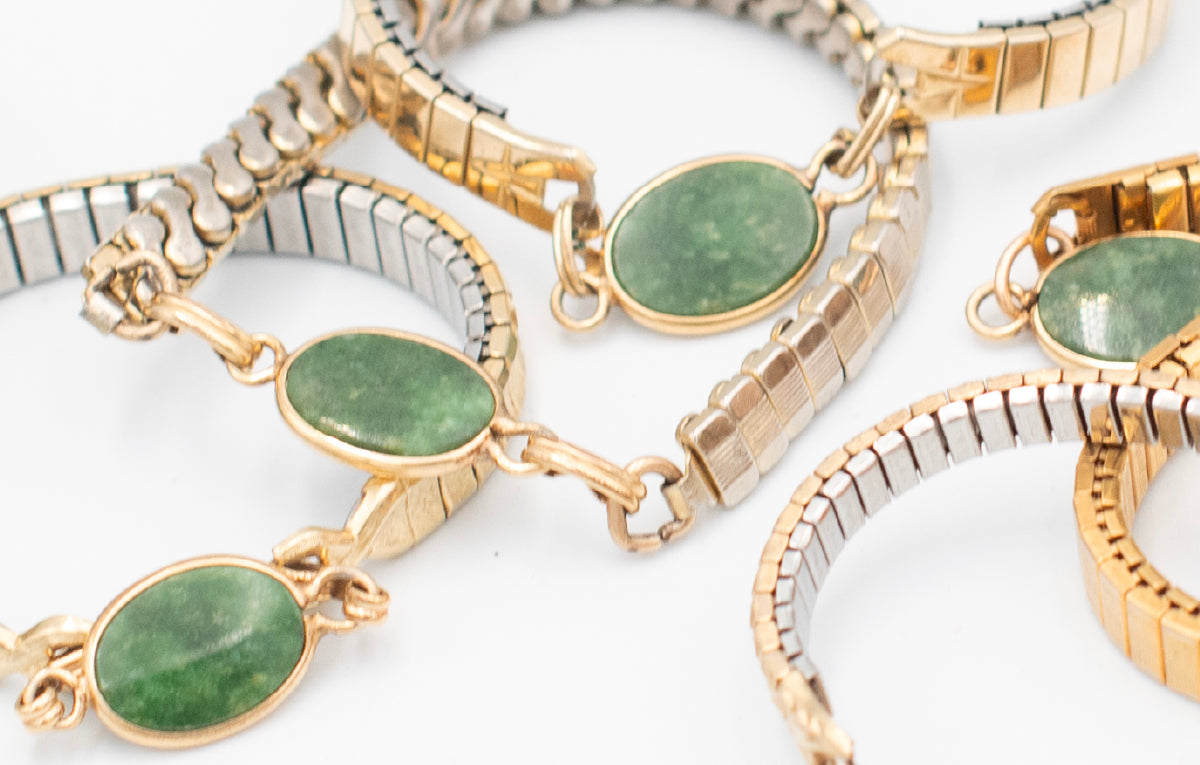 These bracelets are made from vintage jade stones set in gold-fill, paired with reclaimed, vintage watch bands.